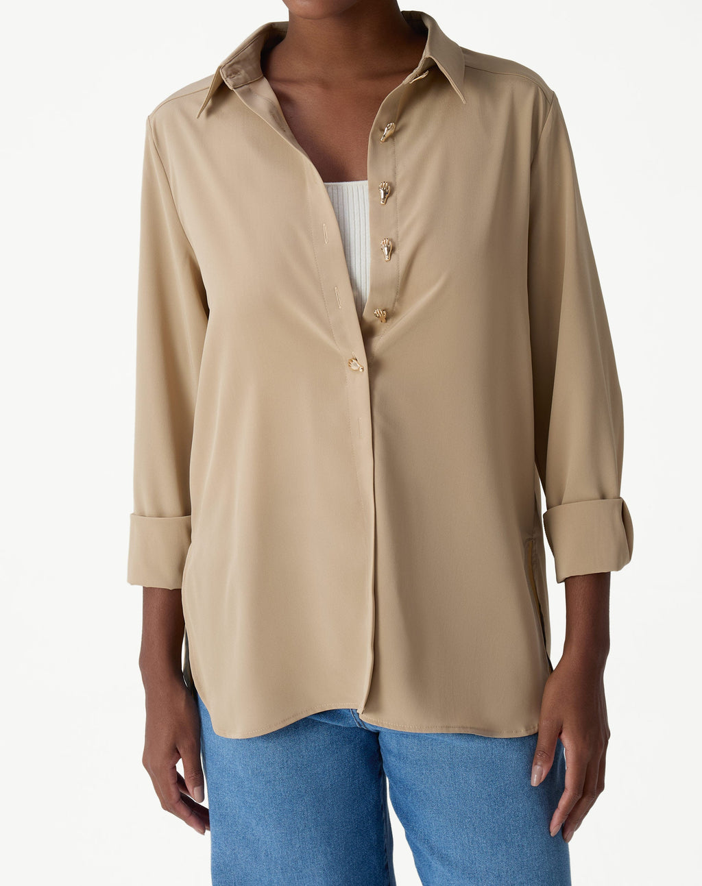A Camisa Alongada com Fenda é um modelo clássico e atemporal, com botões charmosos e modelagem ímpar. Perfeita para construir looks casuais e também elegantes, é uma peça curinga para se ter no armário.