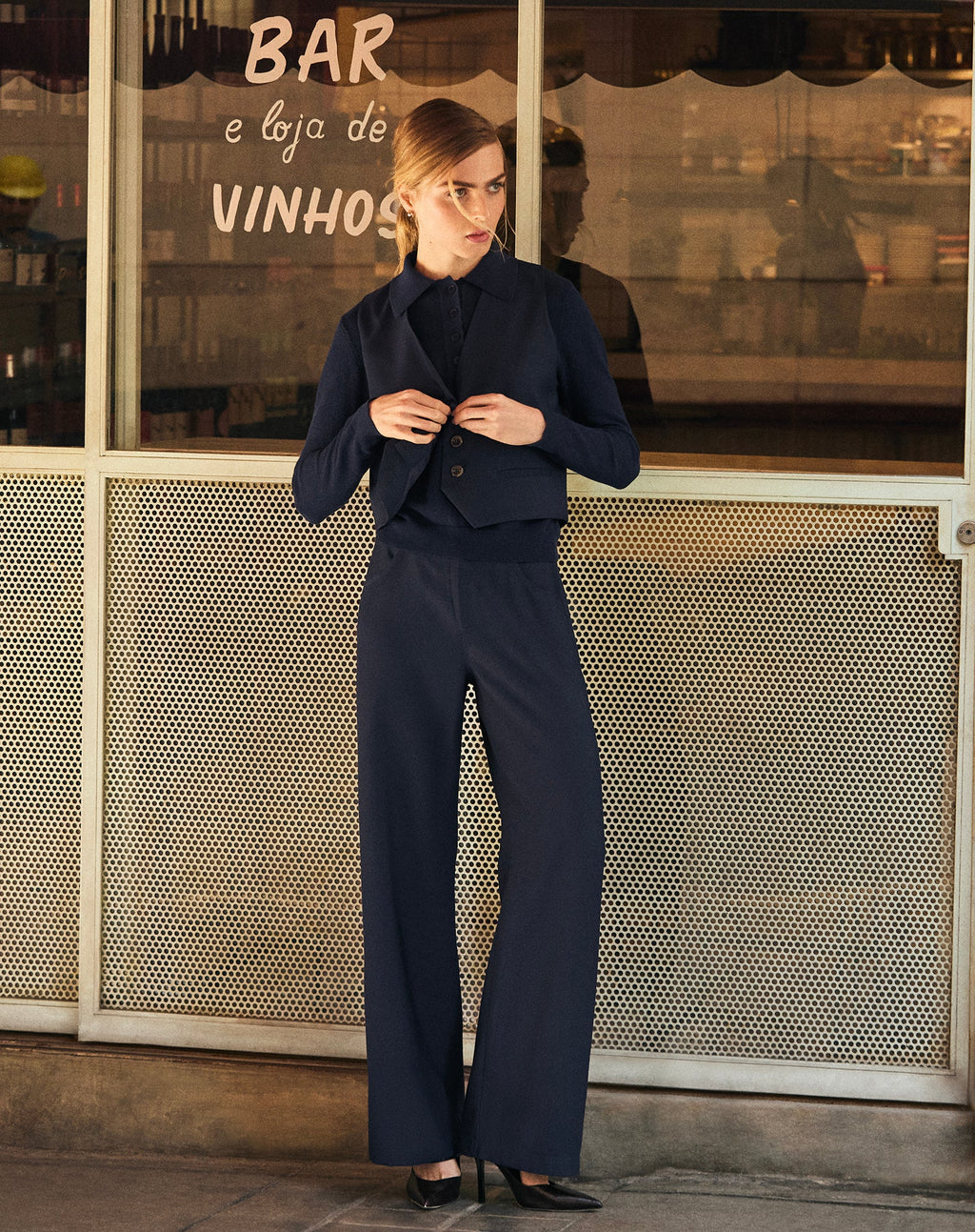 Modelo tem 1.76m de altura e veste o tamanho P / 38